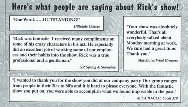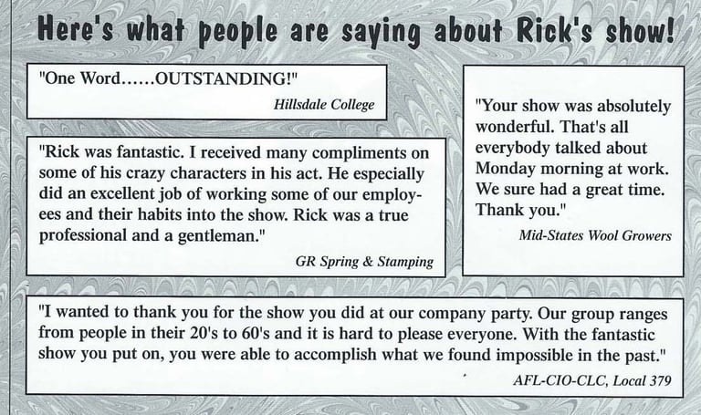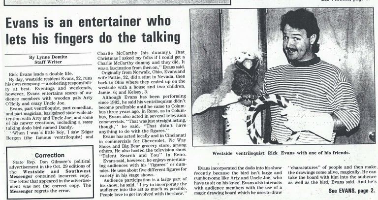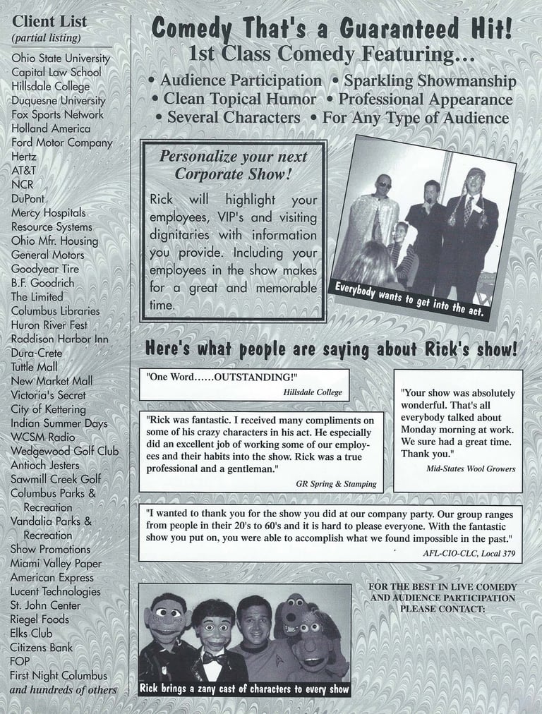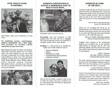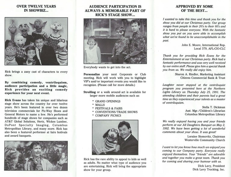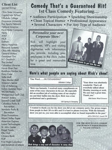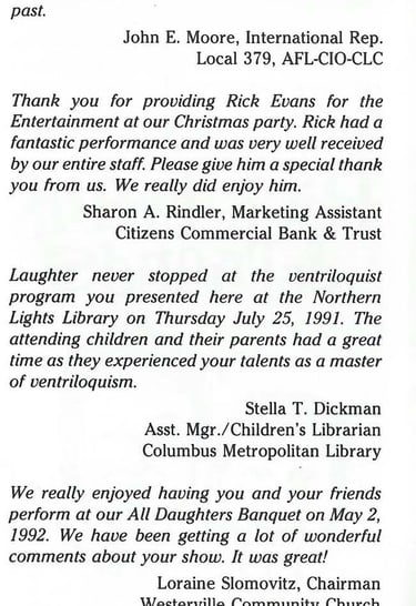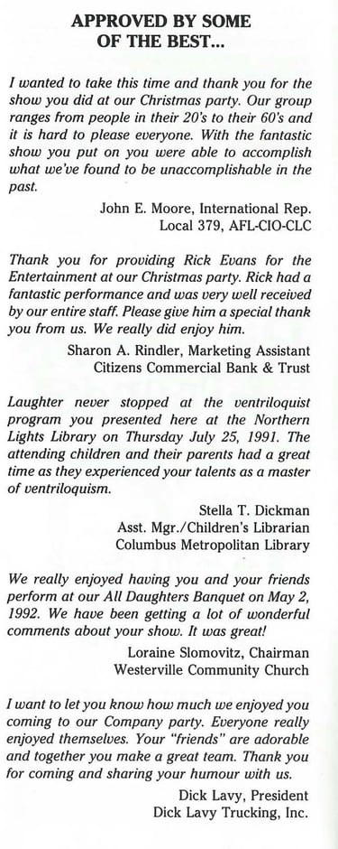 As a professional comedian and ventriloquist I have performed hundreds of comedy shows for libraries, retirement homes, corporate parties, colleges, comedy clubs and cruise lines. I present clean topical humor designed for any group, and I love to get the audience involved. I like to use several characters and keep the show fast paced and fun. I am grateful for the opportunity to be a source of laughter in the lives of others. Please contact me if you are looking to add some live entertainment to your next show or gathering. And check out some of the reviews below.